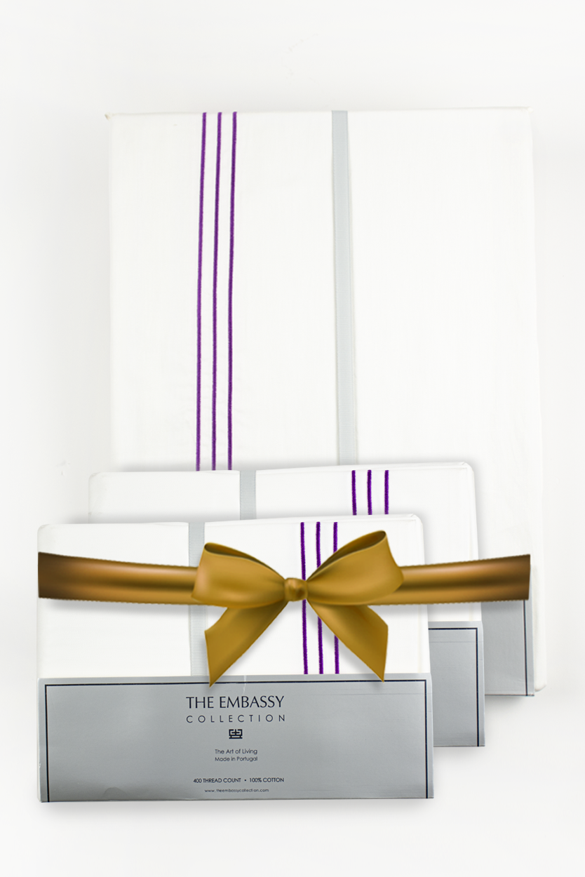 400TC COTTON SATEEN KING DUVET COVER SET ( 3 ROWS ) WHITE / PURPLE